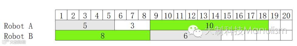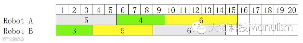 假设RobotA与Robot B共有干涉区Zone1;Robot A无干涉工作5秒,Zone1内工作10秒;Robot B无干涉工作6秒,Zone1内工作8秒;则至少需要18秒才可完成所有工作,其中Robot A等待3秒;Robot A等待4秒。 通过设置两个干涉区我们可以将Robot A的Zone1(10秒)拆分成Zone1(4秒)和Zone1+Zone2(6秒),将Robot B的Zone1(8秒)拆分成Zone1+Zone2(3秒)和Zone2(5秒)。这样整个工作节拍周期内Robot A无等待,最终节拍为15秒。
