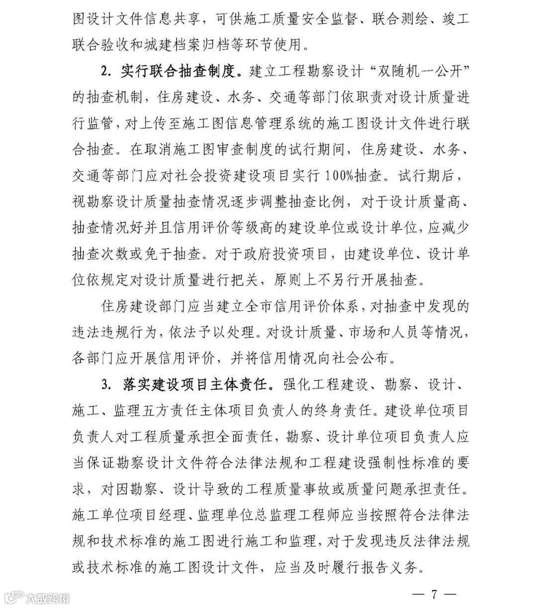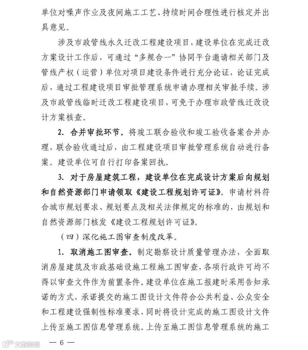 1、取消施工图审查。制定勘察设计质量管理办法,全面取消房屋建筑及市政基础设施工程施工图审查,各项行政许可均不得以审查文件作为前置条件。建设单位在施工报建时采用告知承诺的方式,承诺提交的施工图设计文件符合公共利益、公众安全和工程建设强制性标准要求,同时将设计完成的施工图设计文件上传至施工图信息管理系统。上传至施工图信息管理系统的施工图设计文件信息共享,可供施工质量安全监督、联合测绘、竣工联合验收和城建档案归档等环节使用。
