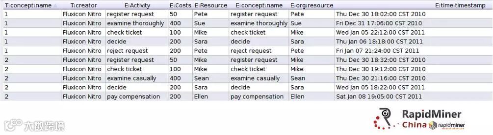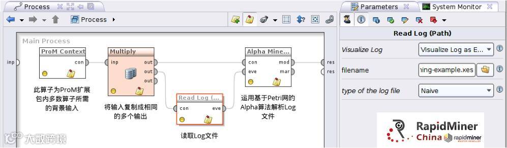 首先,我们将日志数据导入RapidMiner,这里注意ProM支持标准事件日志格式XES(可扩展事件,eXtensible Event Stream)。