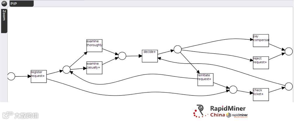 图中包含了若干Transition(方形节点,即日志文件中的各项活动)和Place(圆形节点,此例中可以理解为各活动之间的“静止”状态),从这张图可以清晰地看出流程各节点和工作流走向。