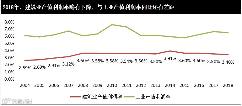 根据统计局数据,2018年全国具有资质等级的总承包和专业承包建筑业企业利润8104亿元,比上年增长8.2%,其中国有控股企业2470亿元,增长8.5%。我们用全国具有资质等级的总承包和专业承包建筑业企业利润与建筑业总产值的比值代替建筑业企业产值利润率。2018年建筑业的产值利润率在3.5%左右。