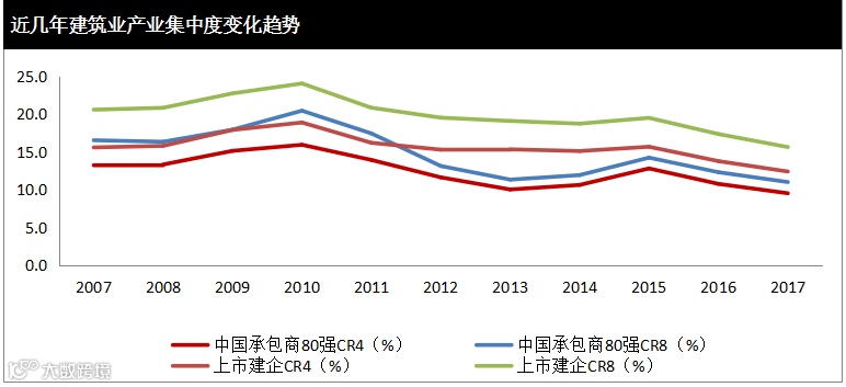 目前国内建筑业产业集中度仍然较低,中国承包商80强的CR8产业集中度从2007--2010年度增长至20.4%峰值后,从2011年建筑业产业集中度逐年回落至2013年的11.3%,之后2014年、2015年小幅上升至14.2%,2017年回落到11.0%。鲁班研究院观察的上市建企CR8产业集中度的趋势与之相同,在2017年,达到24.0%之后,逐年回落至2014年的18.7%,2015年达到19.5%,2017年又回落到15.6%。2017年,四个行业集中度数值较2015年均有下降,可能是与2017年建筑企业数量增长,竞争加剧有关。2017年两者的数值均低于20%,可见我国的建筑业属于分散竞争型,处于过度竞争状态。