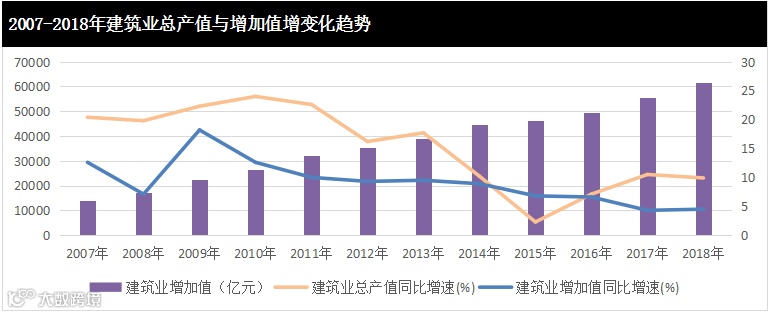 固定资产投资额在很大程度上决定了建筑市场的规模,建筑行业发展增速与固定资产投资增速密切相关。2007年-2018年,我国建筑业总产值占固定资产投资额比重从2007年的42.60%逐年递减,2016年占比仅32.45%,2017年、2018年占比呈上升趋势,2018年提高至36.98%。从下表中可以看出,2011年-2016年间建筑业总产值增速一般低于固定资产投资增速。2018年,建筑业总产值在固定资产投资增速趋缓的形势下,增速至9.9%,可见固定资产投资增速带动建筑业总产值的效果在小幅回落。
