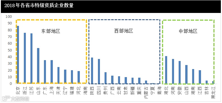 从地域上看,2018年我国资质区域分布仍然非常不平衡,东部地区特级资质企业数量多,水平比较高,而西南、西北、东北、中部地区特级资质企业数量偏少,建企资质水平普遍偏低,整体资质水平有待提升。各省市特级资质企业数量来看,北京、浙江、江苏、山东四省市的建筑数量排名前四。毫无疑问,浙江、江苏是传统的建筑大省、强省,建筑企业数量多,实力相对出众,特级资质企业数量排名靠前是众望所归。而北京是建筑央企、国企的总部所在地,建筑企业总部实力一般比较雄厚,北京排名靠前也在意料之中。