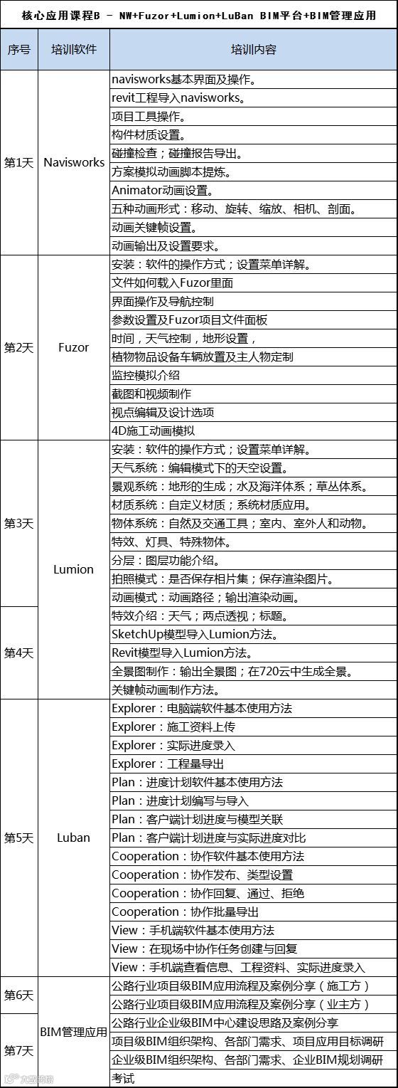 核心应用课程B - NW+Fuzor+Lumion+LuBan BIM平台+BIM管理应用 |