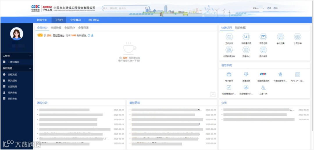 打造专属工作台,集中推送企业信息、流程待办,让工作处理更专注与高效,【快速访问】可以一键通达工作安排、本部通讯录、领导信箱、会议纪要、公司标准、内网新闻发布、流程中心等模块;【信息系统】可免密切换到各类系统,包括电子邮箱、法律系统、统建系统、电子采购平台、内网门户、项目管理ERP、PRP、三重一大等,让工作更便捷。
