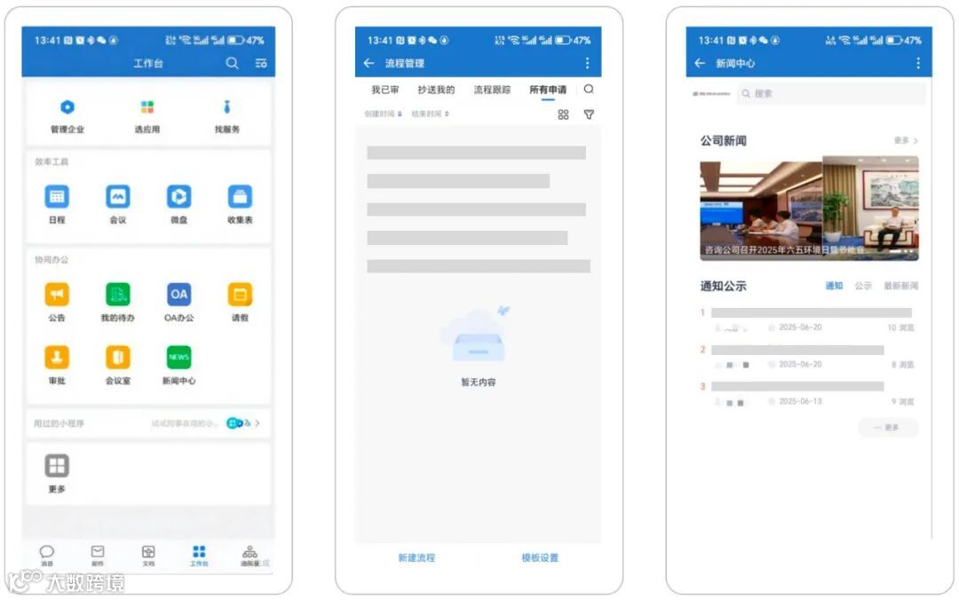 通过集成企业微信,打造移动门户工作平台。打开手机企业微信,即可通过我的待办、OA办公、新闻中心等,实现高效的沟通交流与协同办公,让审批、学习等更敏捷。