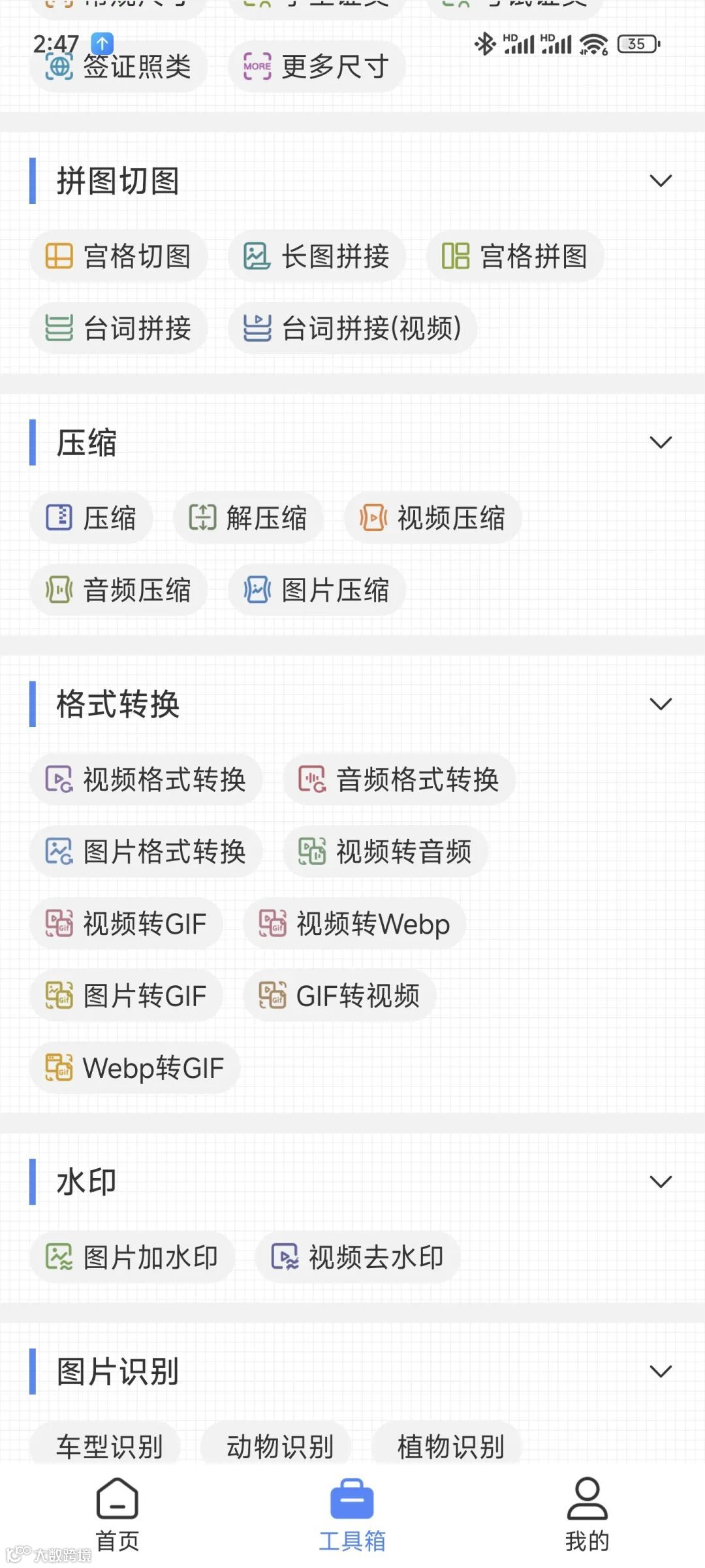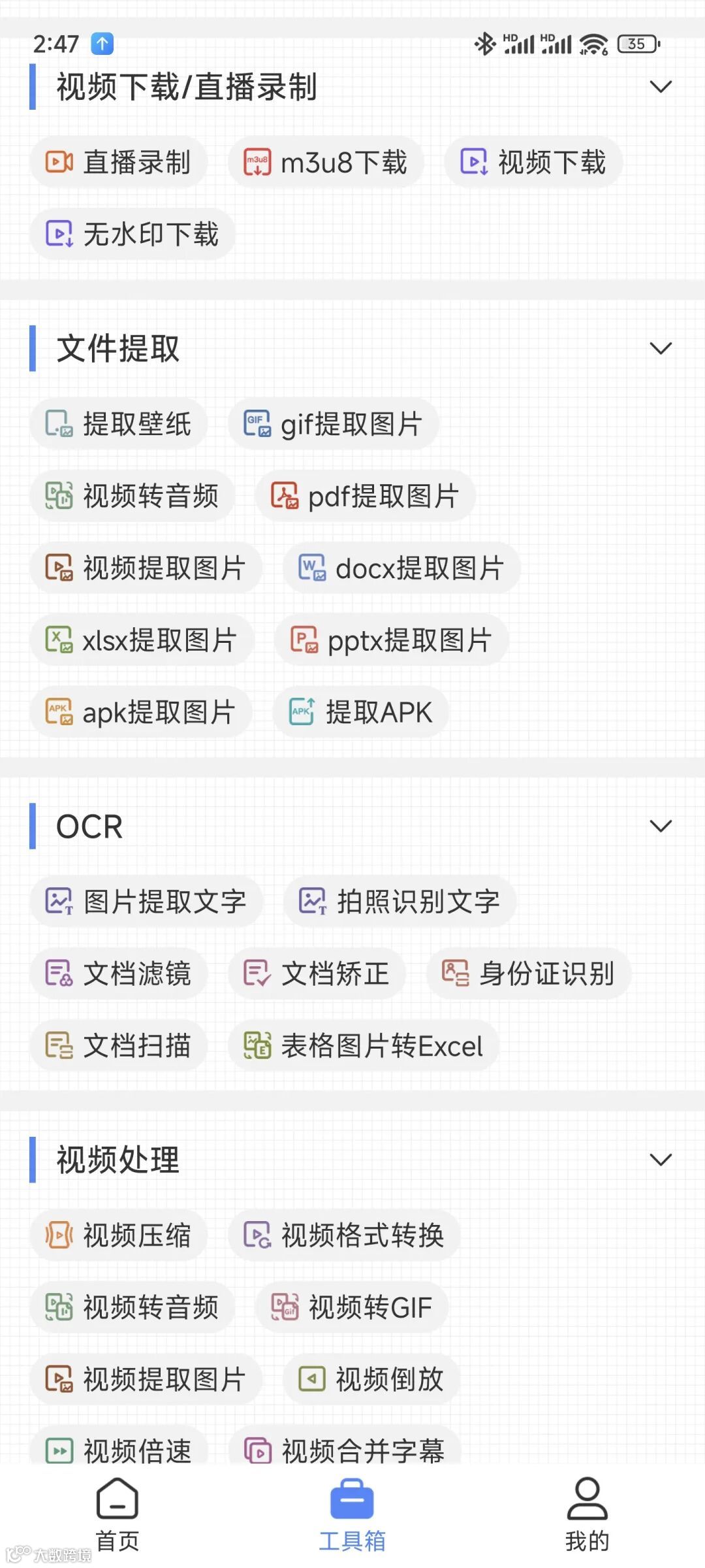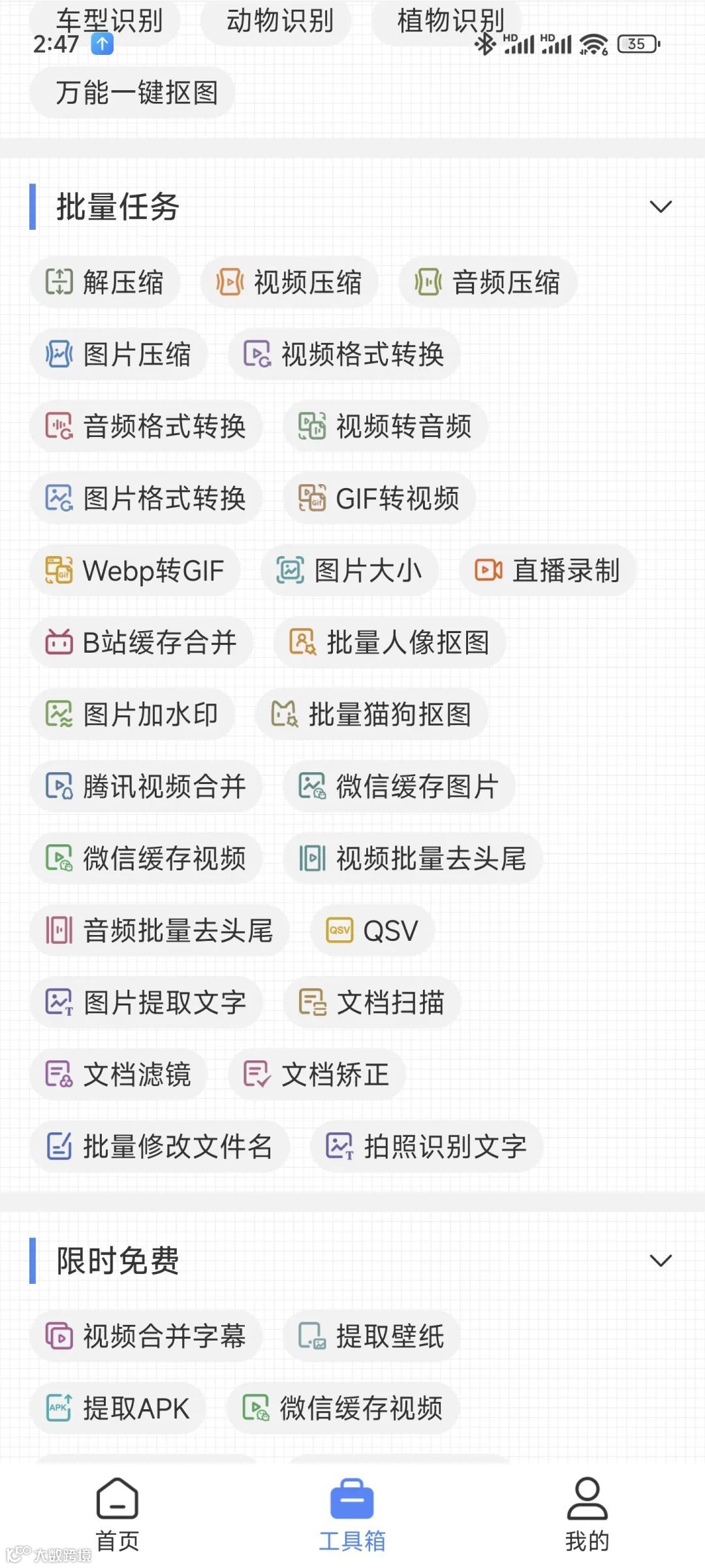 它设计简洁,核心功能离线可用,涵盖压缩/解压、图片处理、视频音频编辑、文档转换等三十余项,界面友好,基本没有广告。