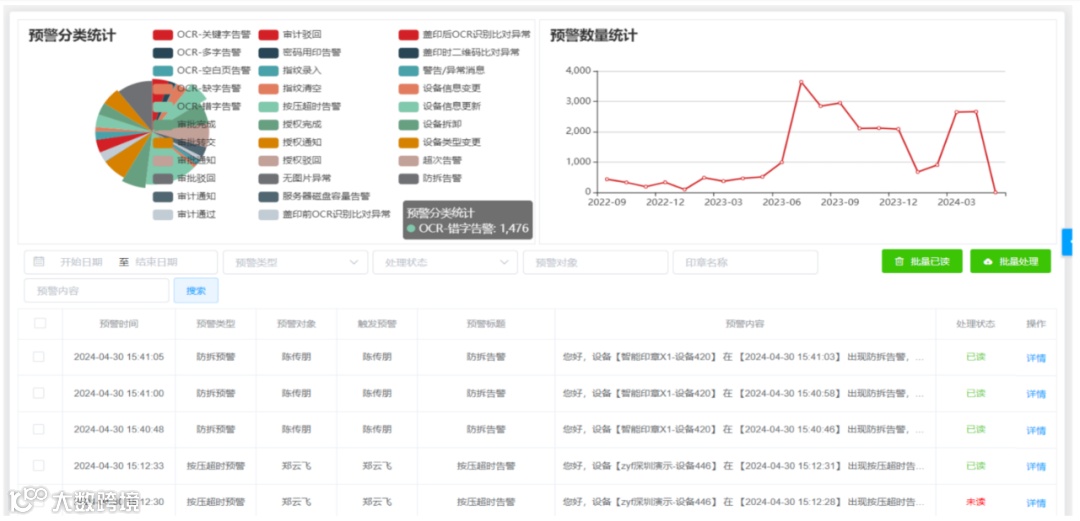 异常实时处置:系统能够直观展示异常数据,方便管理人员实时跟进处置。结合AI智能审查功能,实现全场景、全时间的印控管理。