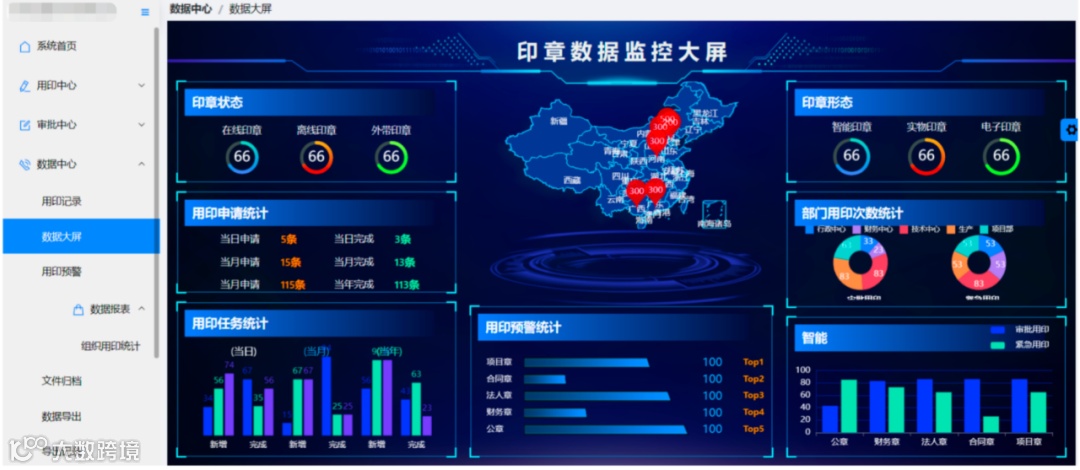 实时数据驾驶舱:通过大屏展示数据驾驶舱,实现印章使用情况的直观监管。系统数据实时更新,保障监管的及时性和有效性,让管理人员能够快速掌握全局情况。
