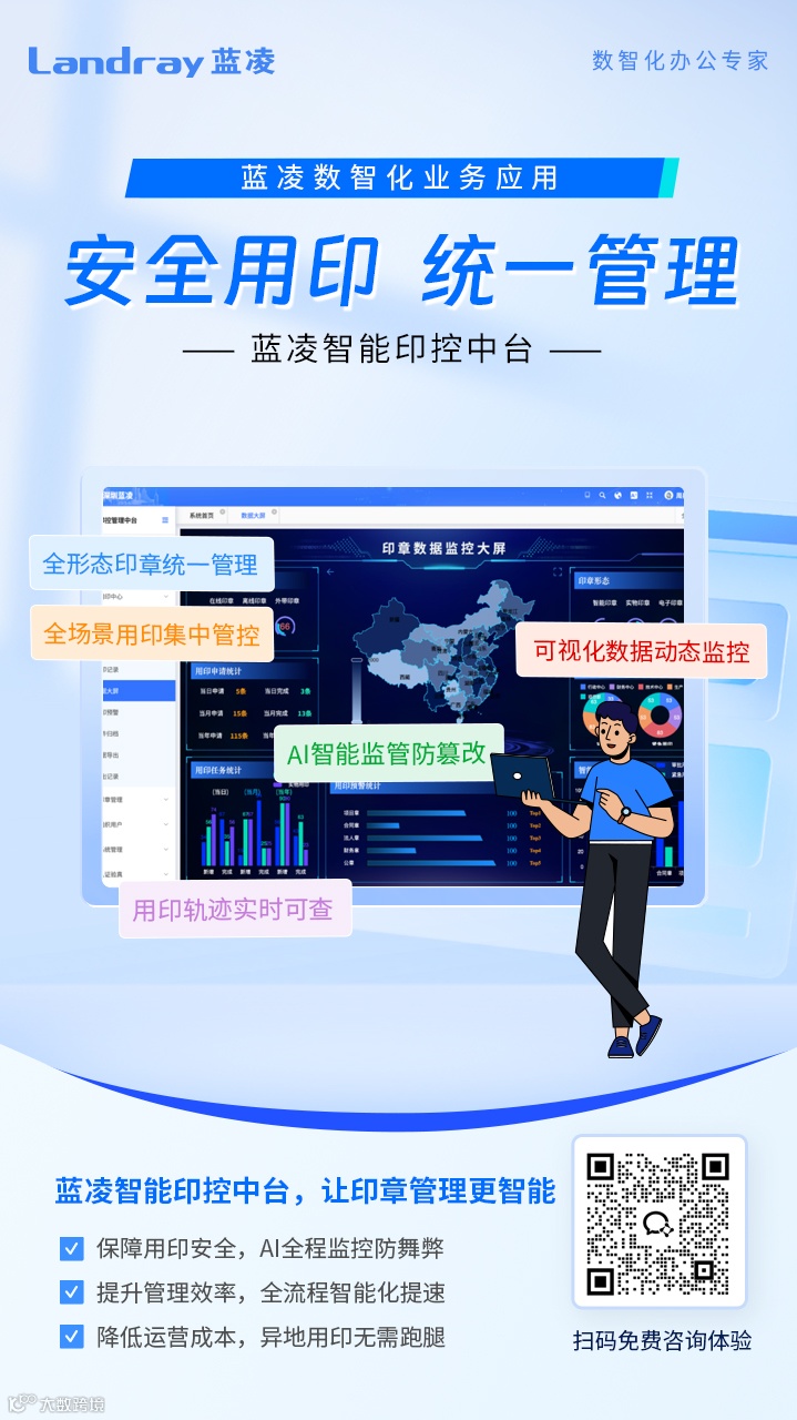 从传统人工管控到数智化全流程治理,蓝凌智能印控中台以“安全、高效、合规、降本”的技术赋能,打破了印章管理的固有瓶颈,为政企各类组织构建起适配其数智化转型需求的印章管理新生态。