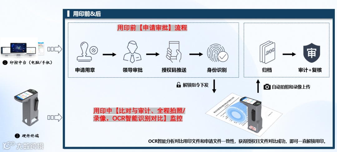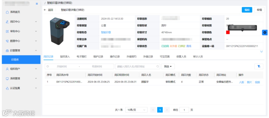 同时系统采用了AI+视频+OCR等技术,用印过程自动记录和全程监控录像,实时记录用印人、时间、地点,并自动拍照用印内容,保障用印安全合规。