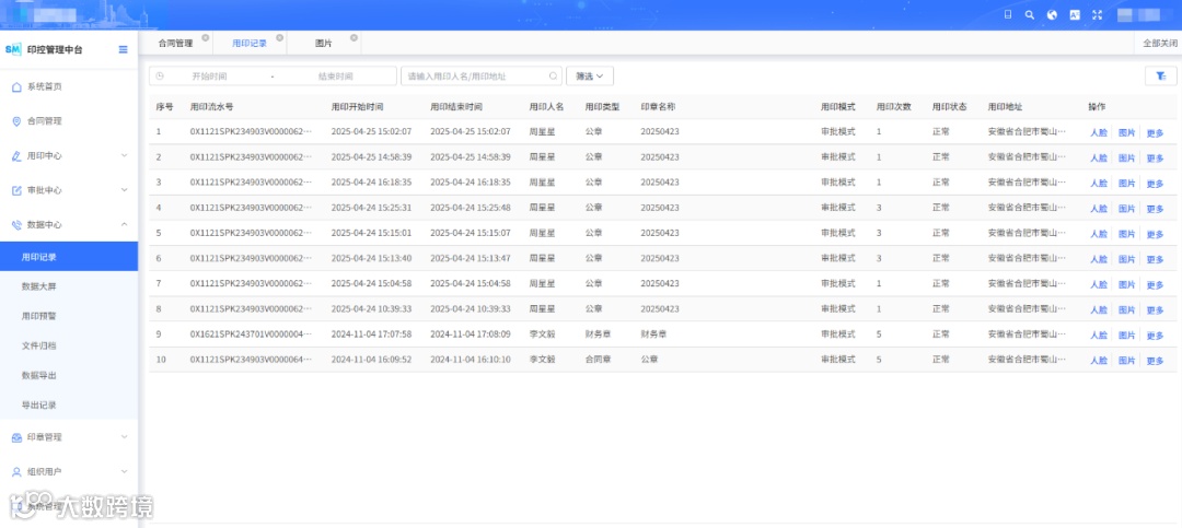 平台实时生成用印记录台账,并上传至平台可供随时查看,满足审计与可追溯要求。