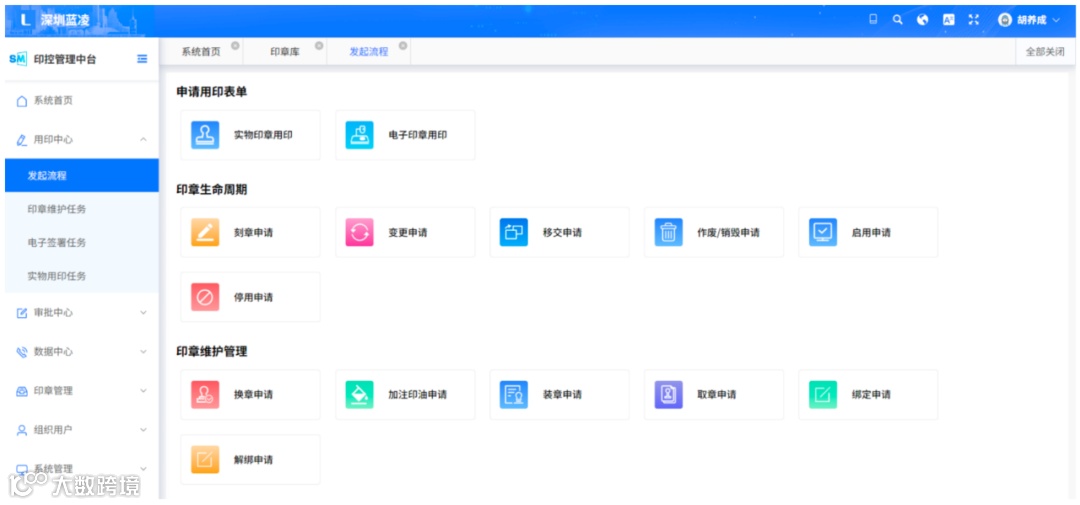 针对以上痛点,蓝凌智能印控中台融合“智能印章、实物印章、电子签”管理能力,用“统一用印、统一管控、统一签署、统一审计、统一流程”的“五个统一”理念,实现印章管理的全面智能化升级,为组织提供全场景、全流程的印控服务。