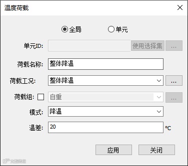 (1)整体升降温:有限元模型-温度荷载-温度荷载-全局-添加升降温,具体设置如下: