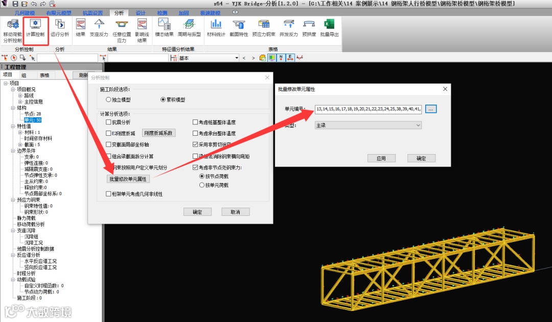 (4)通过分析-计算控制-批量修改单元属性,可将桁架单元修改为梁单元。