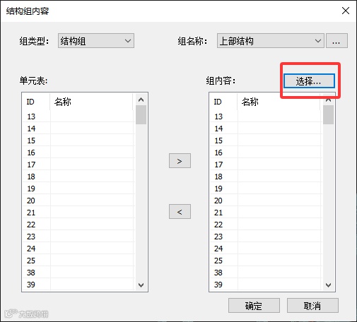 在有限元模型-编辑单元-组中选择结构组/边界组,可通过左侧表格选择对应单元和边界条件添加到右侧对应结构组/边界组中。具体设置如下: