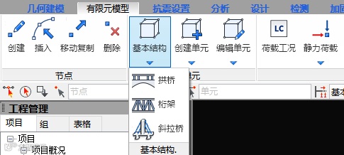 YJK Bridge中对桁架桥、拱桥、斜拉桥支持通过有限元模型菜单下基本结构的建模助手快速生成模型。