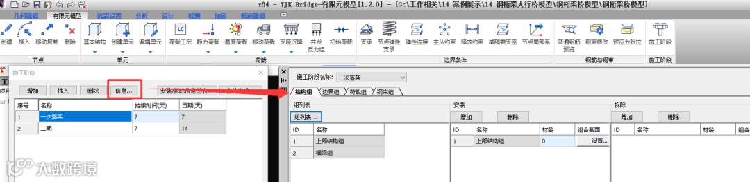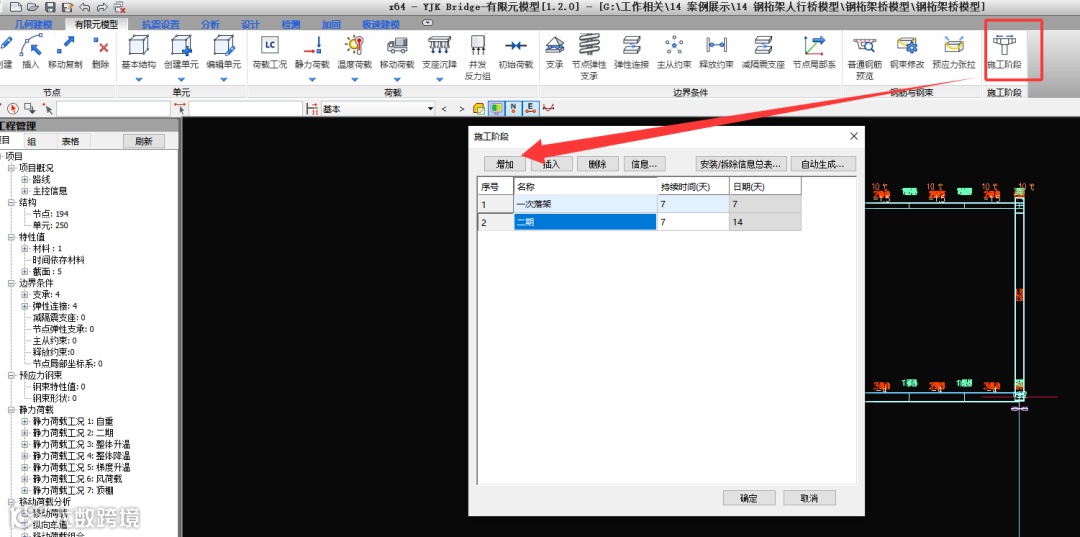 YJK Bridge中可以考虑钢桁架桥施工阶段分析。在有限元模型界面下-选择施工阶段-添加,可添加多个施工阶段并进行对应编辑。设置如下: