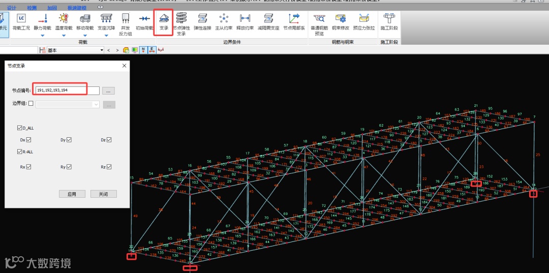 (3)添加节点约束:有限元模型-边界条件-支承-选择节点-添加约束。