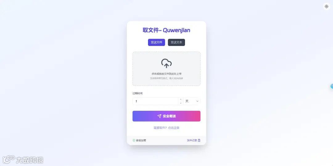 第二个是取文件(https://quwenjian.cc/#/send/)。这个在线文件传输工具太实用了!前几天需要给客户传一个8GB的设计稿,用它拖拽上传,设置24小时有效期,客户顺利收到。无需注册、无广告、不限速,还能灵活设定提取条件,临时分享大文件再也不用愁了。