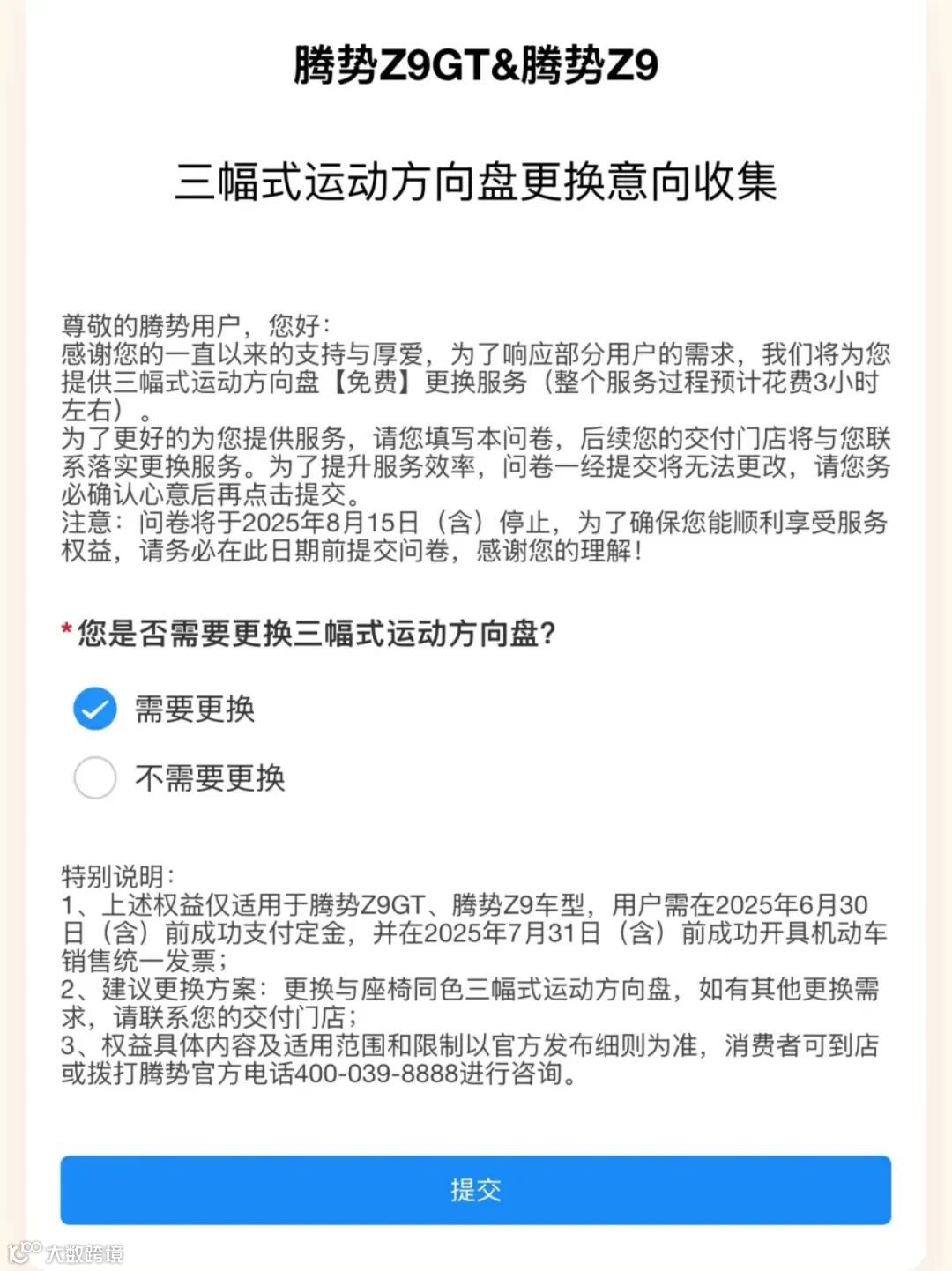 - 5月30日 — 8月15日:在此期间会按照每周一频次,陆续向已提车用户推送更换意向收集问卷,用户最迟需在8月15日确认心意并提交问卷。