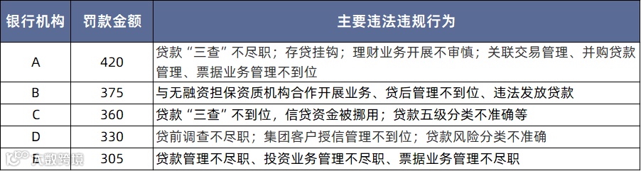 在对机构的处罚中,共开出17张超百万罚单,其中TOP 5超300万罚单均聚焦信贷业务,涉及贷款 “三查”不尽职、违法发放贷款、信贷资金挪用、关联交易管理不到位等严重违规行为。
