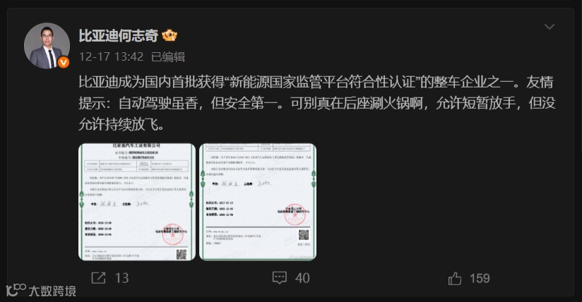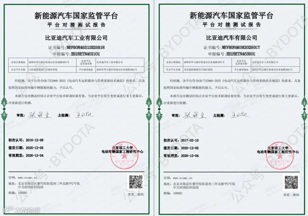 近日,比亚迪传来重磅消息,成为国内首批获得新能源国家监管平台符合性认证的整车企业!这份由北京理工大学电动车辆国家工程研究中心出具的认证报告,明确认可比亚迪平台完全符合GB/T32960-2025《电动汽车远程服务与管理系统技术规范》,具备按国家标准传输车辆数据的核心能力!