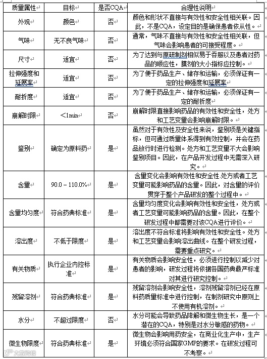 口溶膜制剂产品质量属性主要包括外观、气味、尺寸、机械强度、崩解时限、鉴别、含量、含量均匀度、溶出、有关物质、溶剂残留、水分、微生物限度等。详情如下表: