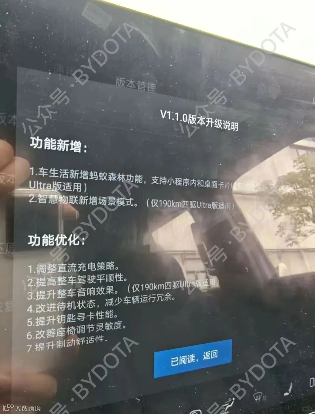 所有固件的版权归属BYD所有,公众号仅提供系统固件更新资讯的整理及资源分享。如怀疑固件来源的可靠性,可以联系您当地的4S售后门店获取升级。
