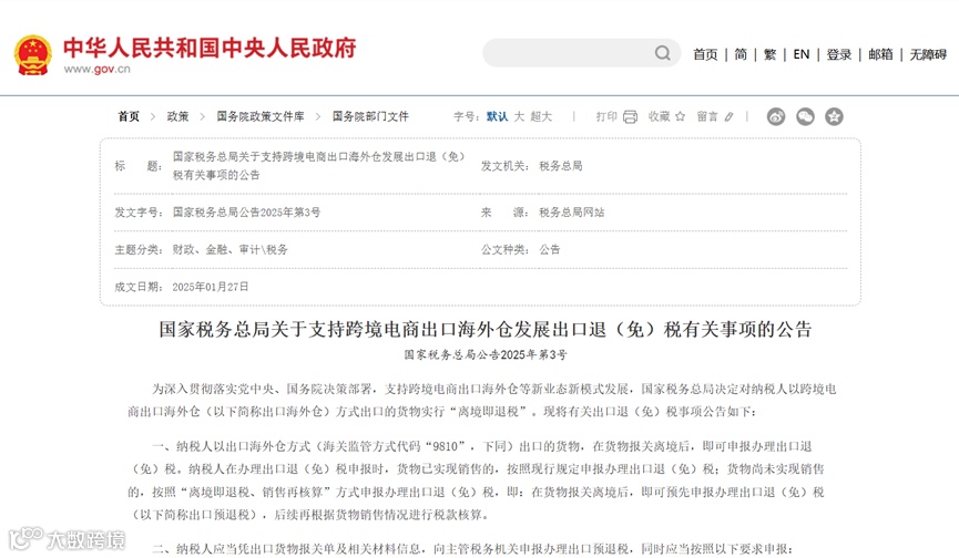 2025年1月27日,国家税务总局2025年第3号公告正式发布,标志着9810模式出口退税进入“离境即退税”新时代。本文将深度解析这一突破性政策,同时分享如何借助海外仓平台实现退税资金“提前回笼”,为企业提供专业指引。