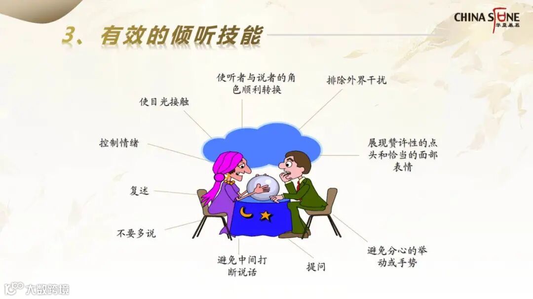 - 用对方乐意的方式倾听,适时回应;