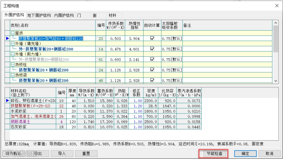 •【工程构造】可跳转【节能检查】,便于根据标准限值及时调整建筑做法。