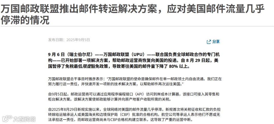 根据联合国国际邮政联盟(UPU)数据,政策实施当日,美国入境邮件量较前一周骤降约81%。