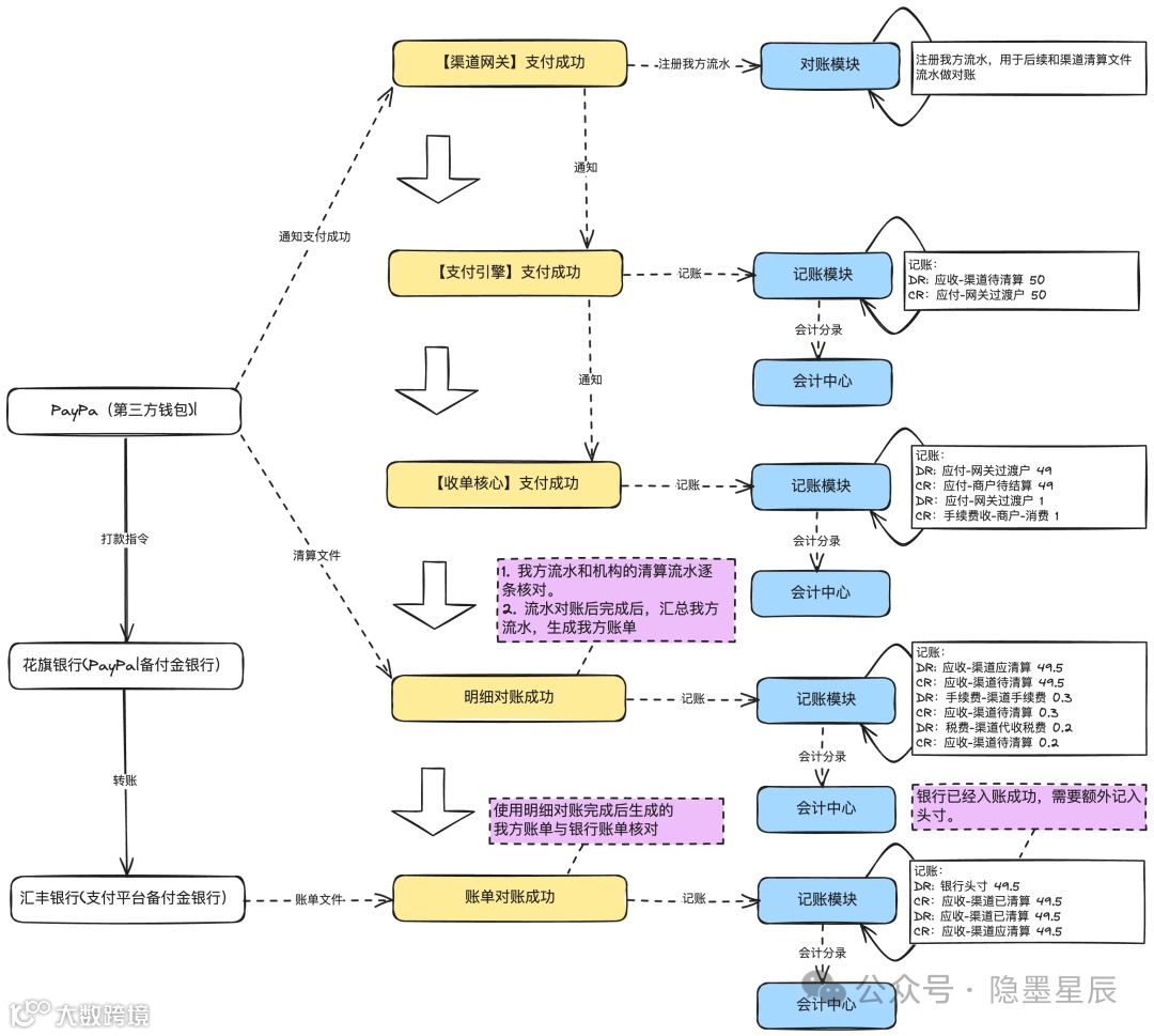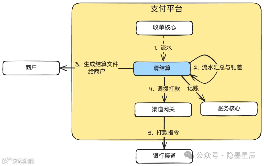 - 图示为正常支付场景,未包含对账差异(如长短款)、账单不平(渠道少打或多打款)等异常情况。