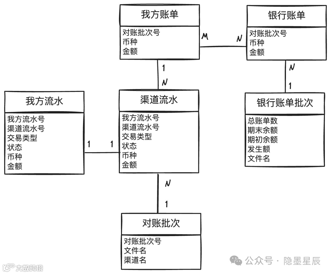 - 流水对账后生成我方账单,再与银行账单对账,二者为多对多关系(因银行可能分次打款)。