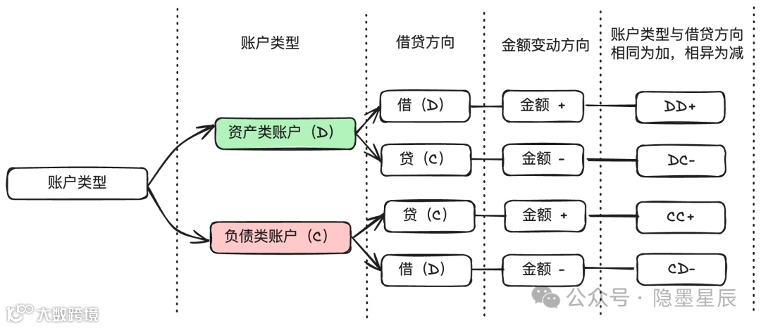 - 记账规则:账户类型与借贷方向相同则加,相异则减,即“DD+,DC-,CC+,CD-”。