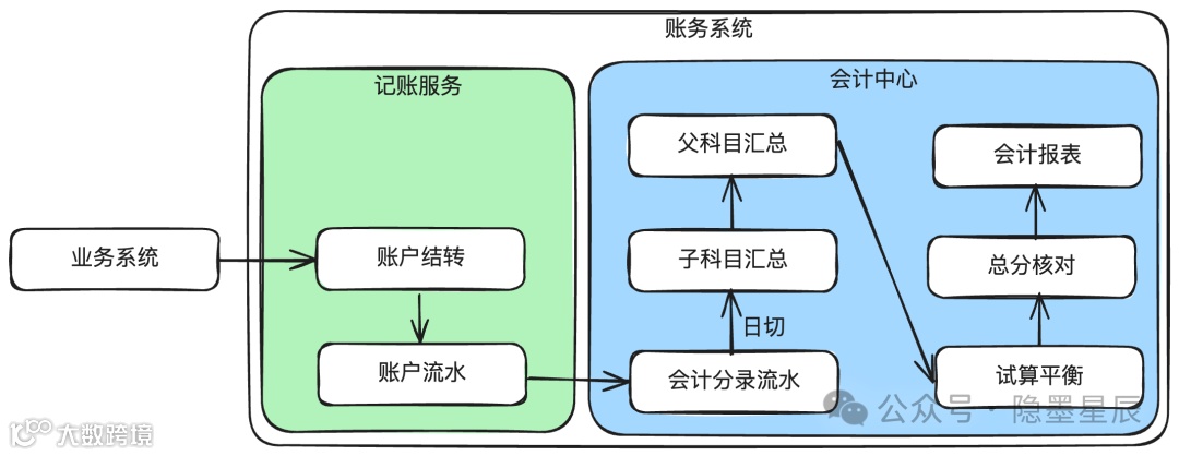 记账服务关注账户余额变动,会计中心则聚焦会计分录、科目汇总与报表生成。图示为简化模型,实际逻辑更为复杂。