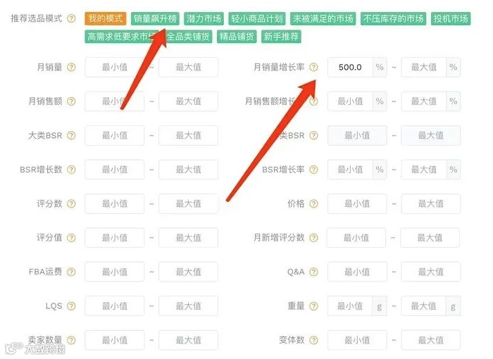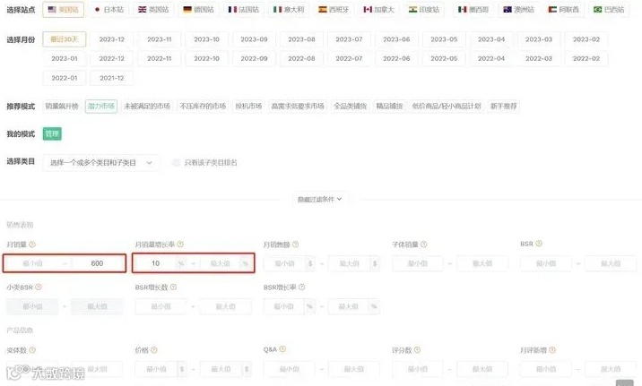 以冬季产品为例:但是今年还没有到这个时间,我们可以点击上一年冬季的销售数据,然后输入月销量增长率指标,将月销量增长率维持在100%到500%以上,类似于销量飙升榜。