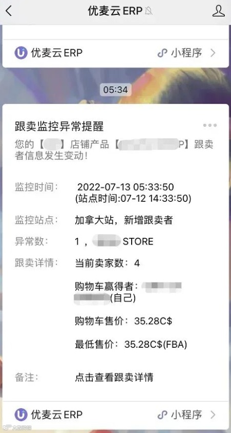 另外我们可以通过小程序获得跟卖提醒: