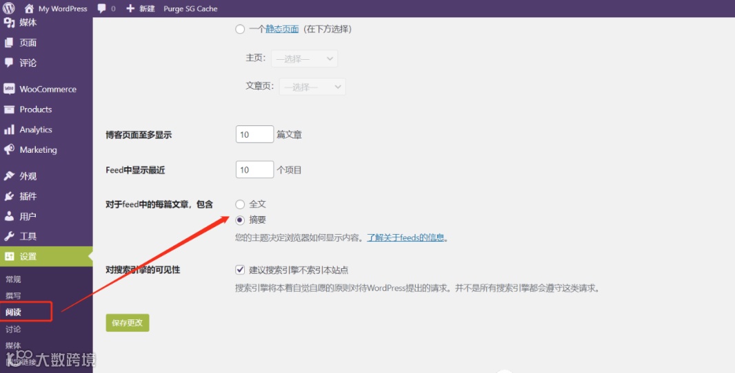 找到设置中的阅读。我们可以看到对于每篇文章的feed默认的是全文,那么当你后期调用文章到你的首页,会直接显示全文,导致你的页面很不美观,我们的目的只是展示我们的文章简介从而引导客户点进我们的blog页面。所以应该设为摘要。