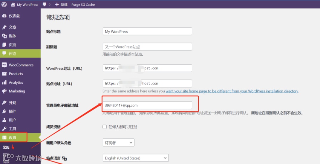 在设置里面点击常规,这里我们会看到管理员邮箱和时区。这里的管理员邮箱的作用是接收一些网站的信息,比如某插件更新等等通知。时区我们呢可以选择中国,选择之后后期网站后台的时间会以中国时间为准,比如你更新文章等等,时间会是中国的时间。