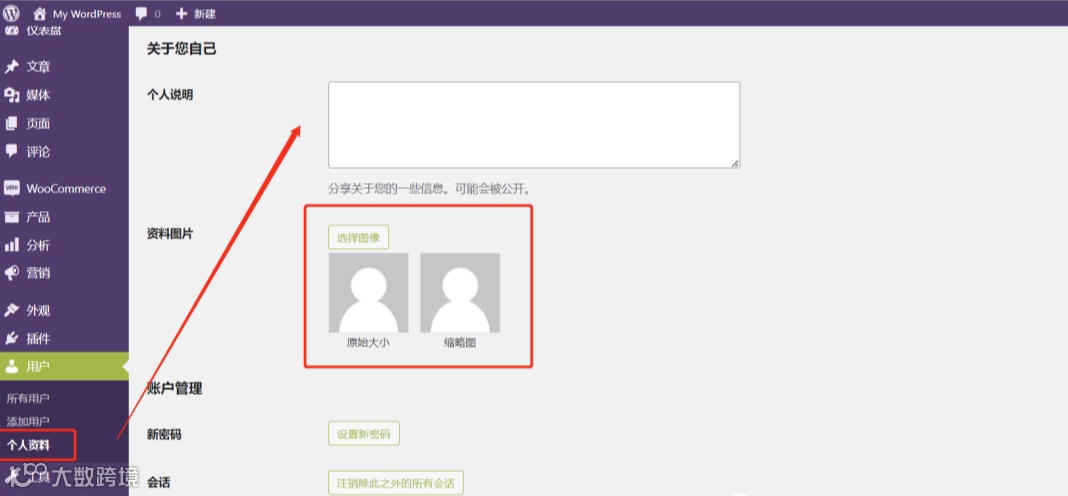 启用插件之后我们在左侧边栏找到用户,点击个人资料,找到关于自己这里。这里有一个个人说明和头像,个人说明这里尽量使用英文,介绍一下自己,展示一下自己的实力。下面是上传图像,可以看到我们安装完One User Avatar之后可以上传头像了,我们可以选择一张个人形象照就可以了。