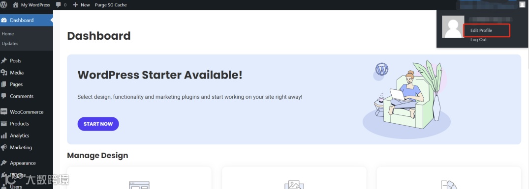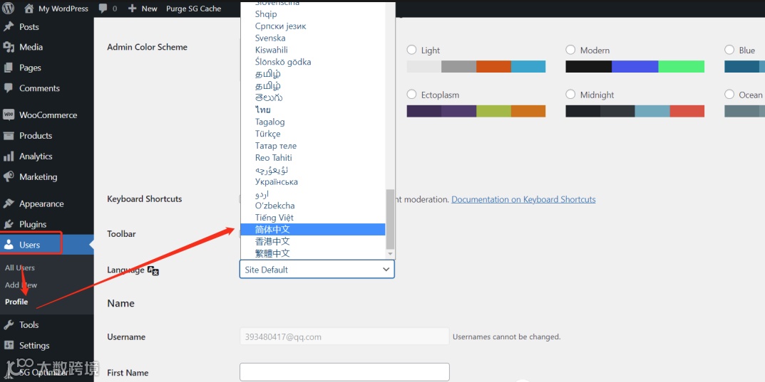 当我们进入到WP后台的时候默认后台语言是英语,为了方便操作我们可以将后台语言设置为中文,如果你的英语很好的话这一步就不用了。鼠标指到右上角的头像,点击Edit Profile进入个人资料设置,点击进入页面之后找到站点语言这里,选择简体中文点击保存,我们的后台语言就已经变成学中文的了。