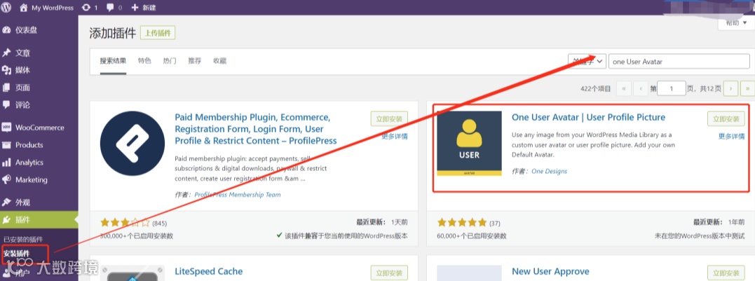 在配置站长信息之前我们需要先安装一个插件,因为WP默认站长信息头像没有办法更改。在左侧边栏找到插件,点击安装插件,在搜索框中搜索One User Avatar.找到一个“小黄人”的头像,点击安装插件,并启用激活。