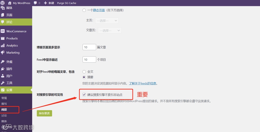 找到设置中的阅读,我们可以看到,对搜索引擎可见性。这里在我们网站没有上线时,一定要勾选。建议搜索引擎不索引站点。如果这里没有勾选。后果就是当你的网站在建立的过程中,很多页面不完整,有很多欠缺。这时候你没有勾选可能会被谷歌搜索引擎收录向客户展示,收录并展示了一个不完整的页面,对于你网站后期的seo的影响比较大。