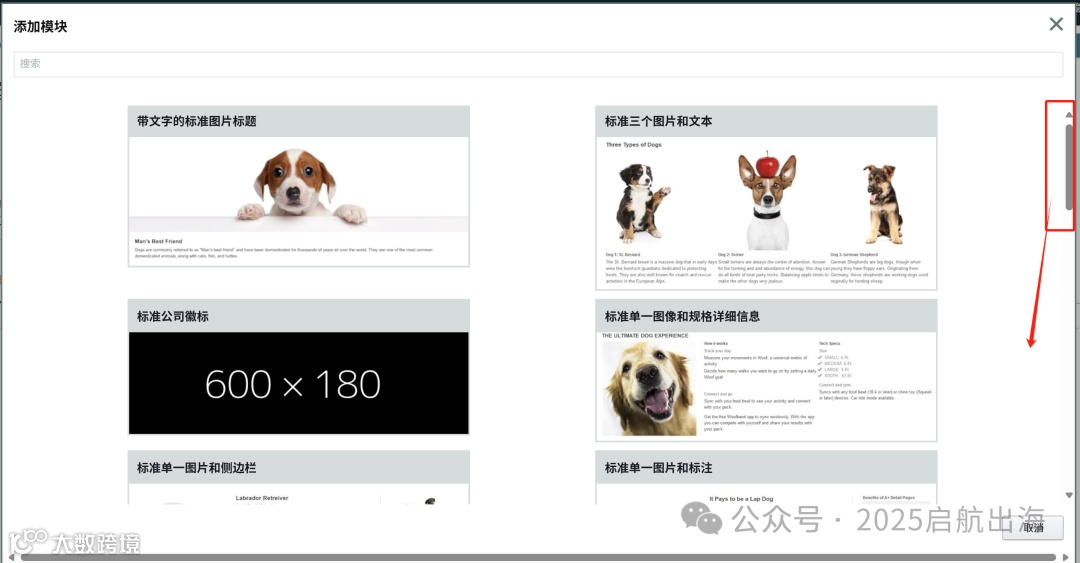 - 根据需求选择模块添加,注意每个模块都有宽高比例要求。
