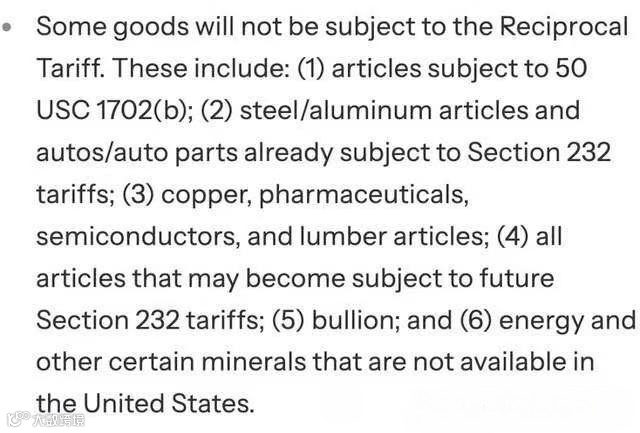 不受对等关税影响的商品: