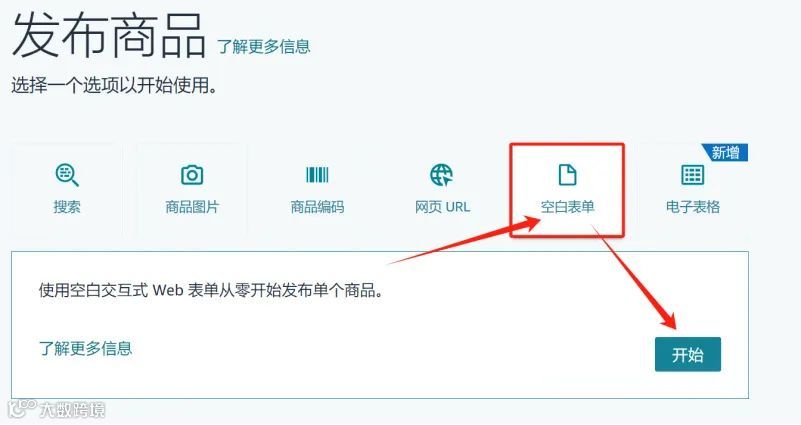 选择商品发布方式,单个上传可选“空白表单”,批量上传则使用“电子表格”模板。