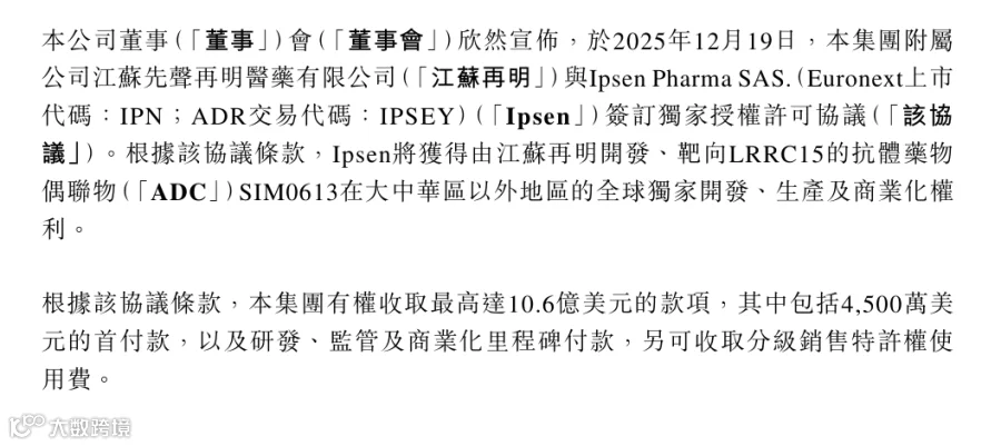 药融圈监测显示:刚刚,先声药业向LRRC15的ADC授权IPSEN。首付款4500万美金。